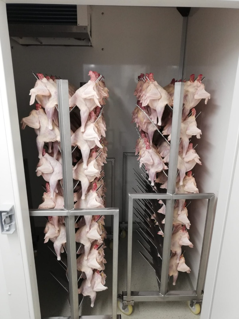 Die integrierte Kühlzelle ermöglicht es, bis zu 324 Legehennen über Nacht auf die vorgeschriebenen 4 °C herunterzukühlen, ohne dass die Schlachtkörper den witterungsgeschützten Wagen verlassen müssen. Lebensmittelhygiene steht dabei für uns an oberster Stelle!
